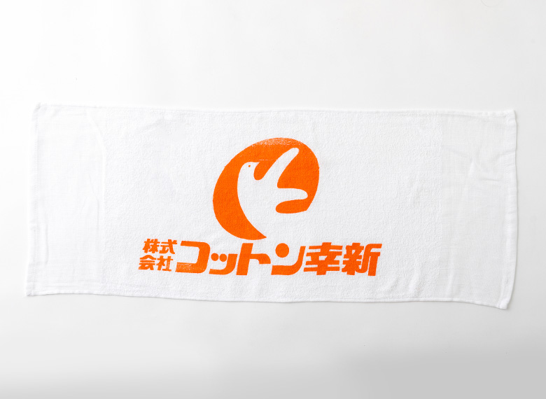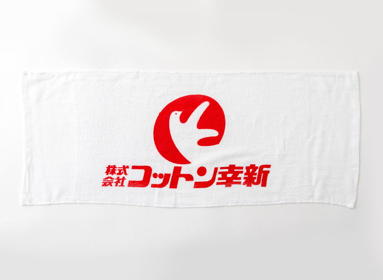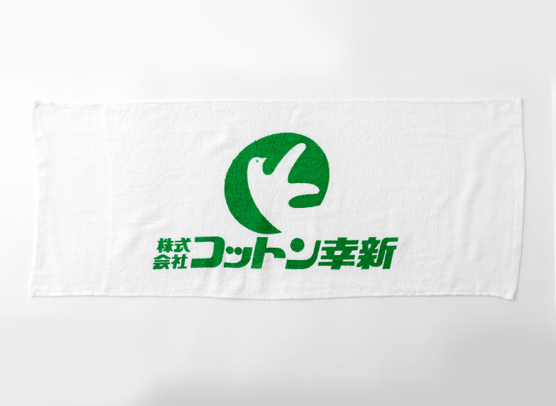 無地の白タオルに、お客様のホテルや旅館名、会社名、ロゴなどをデザインしてお入れいたします。コットン幸新の強みは、プリントの位置です。通常はタオルの平地部分(端から15cm以内の場所)にプリントするのが一般的ですが、コットン幸新ではタオルの中心部分や、ご希望の場所にご希望の形でプリントすることが可能です。