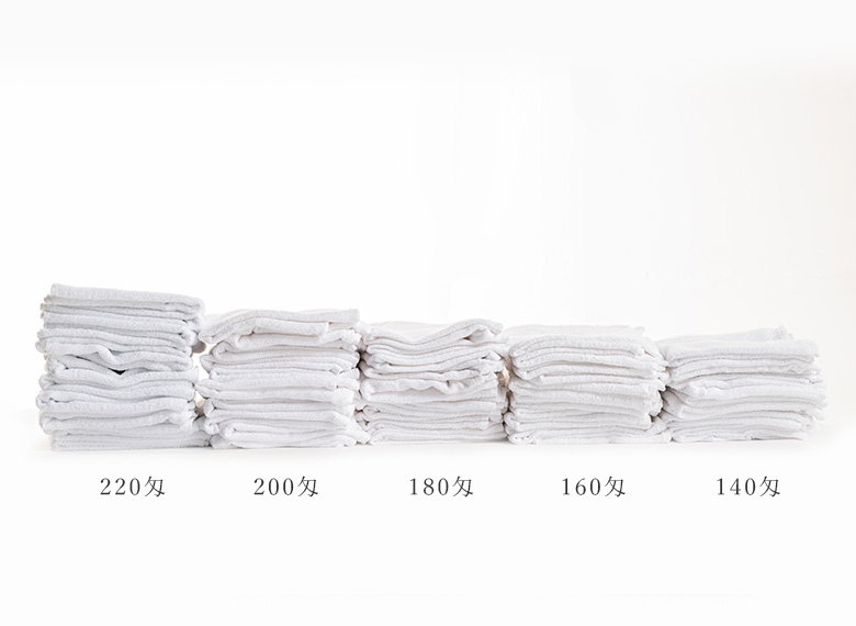 220匁は約68.7gのタオルで、旅館・ホテルでも使っていただいておりますが、これ以上厚くなると、濡れた場合に女性では手で絞りにくくなります。頭や、首に巻いた場合でも、ちょうど収まりのよい大きさです。長く使ってもなかなかへたりません。どちらかというと贈答向きのタオルです。